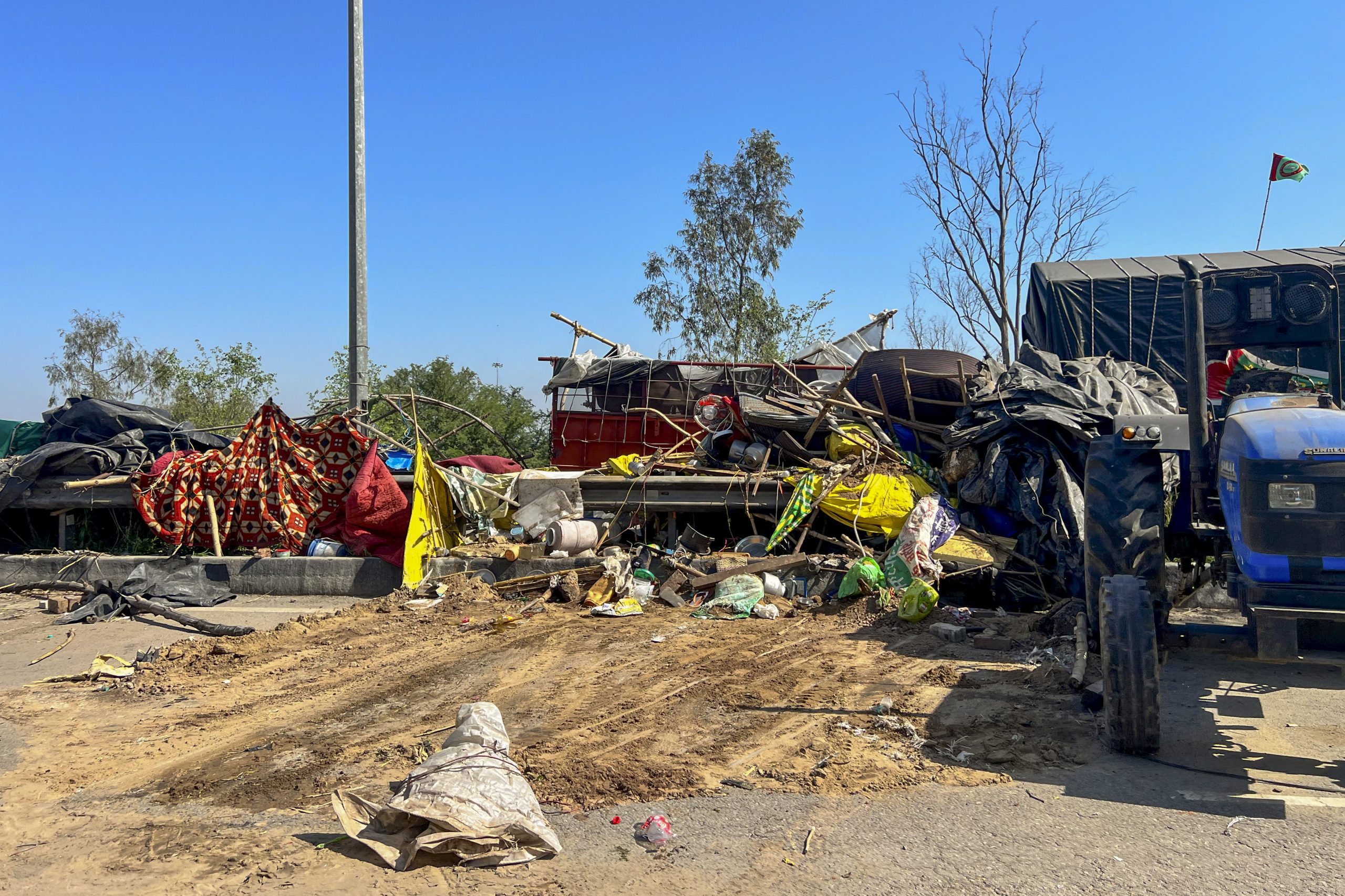 The temporary structures, including sheds and platforms that once served as shelters and meeting points for the protesting farmers, have been razed to the ground. Trolleys, which were turned into makeshift shelters, were seen lying on the road.