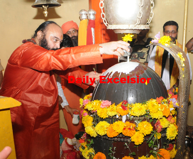 Head priest Mahant Deependra Giri, performing special pooja of “ Chhari-Mubark”, the silver mace of Lord Shiva at the historic Shankaracharya temple , on the occasion of “ Shravan Amasvasya in Srinagar on Friday….Excelsior/Mohd Amin War