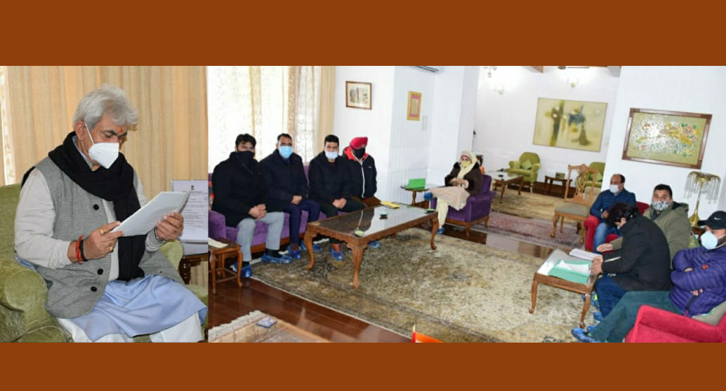 SRINAGAR: Heads of Municipal Bodies of Kashmir, Political leaders, Sportsperson, senior faculty members of SKIMS and MD Ahad Hotels today called on Lieutenant Governor, Manoj Sinha here at Raj Bhavan.