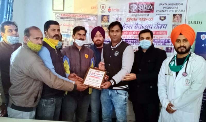 SAMBA, Jan 6: SIBA Events and Samta Mushroom Producers Co Limited, Farmers Producers Organization promoted by NABARD in collaboration with Amandeep Group of Hospitals and supported by J&K Police and J&K Traffic Police today organized ‘Ek-Pahal- Free General Health Checkup camp’ in Nud Bazar, near here to support farmers of Nud block mainly mushroom grower members of FPO and locals.