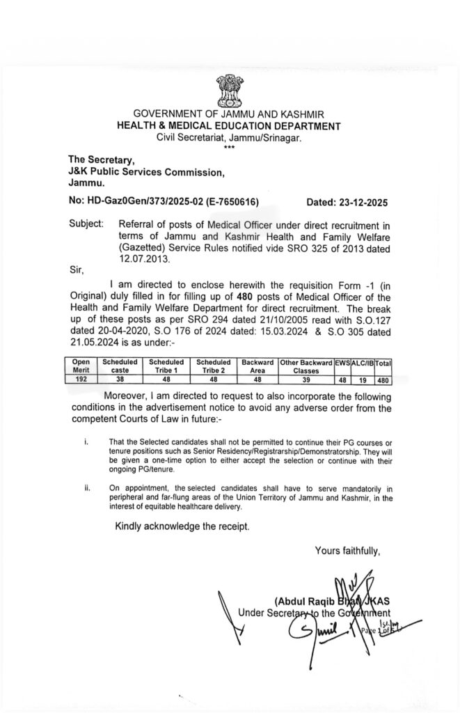 Srinagar, Dec 23: The Health and Medical Education Department of Jammu and Kashmir has formally referred 480 posts of Medical Officers to the Jammu and Kashmir Public Services Commission for direct recruitment, as per official communication issued on Tuesday.
