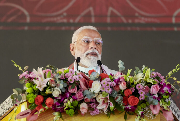 Prime Minister Narendra Modi addresses the gathering during the inauguration and foundation stone laying of multiple development projects, in Puducherry.