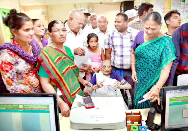 Heeraben,Prime Minister Narendra Modi’s mother displaying a Rs 2000 currency note which she received after exchanging her old notes at Gandhinagar bank on Tuesday. (UNI)