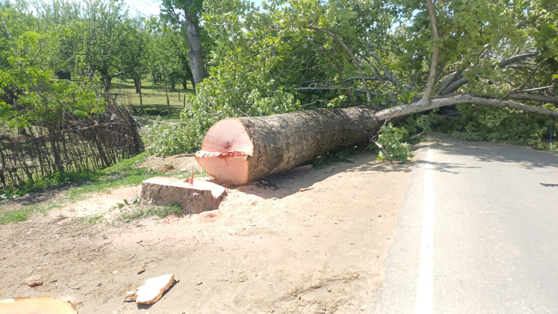 SRINAGAR, Apr 24: A massive decades-old chinar tree was felled near the Ganapora bus stop in the Kralgund area of north Kashmir’s Handwara today.