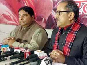 BJP State president Sat Sharma and former Deputy Chief Minister, Dr Nirmal Singh at a press conference at Jammu on Wednesday. —Excelsior/Rakesh