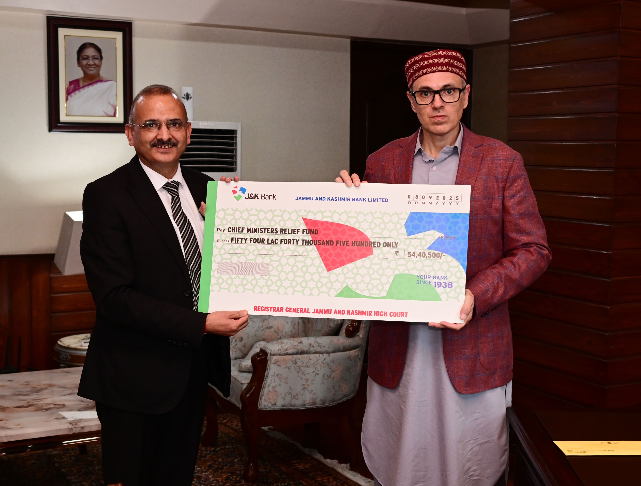 SRINAGAR, Sept 8: In a gesture of solidarity and compassion, the High Court today handed over a cheque of Rs. 54,40,500/- to the Chief Minister’s Relief Fund (CMRF) for the rehabilitation and welfare of those who have suffered due to recent devastating floods in the region.