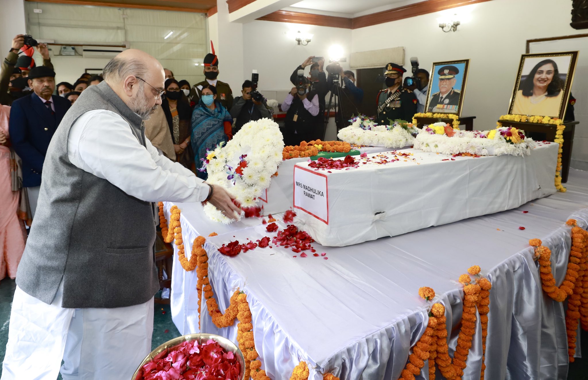 NEW DELHI, Dec 10: Home Minister Amit Shah, National Security Advisor Ajit Doval and Congress leader Rahul Gandhi on Friday laid wreaths on the mortal remains of Chief of Defence Staff General Bipin Rawat and his wife Madhulika Rawat, who were among the 13 killed in the military chopper crash in Tamil Nadu.