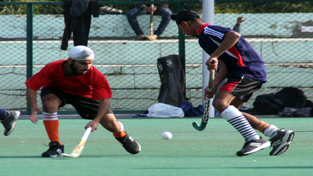 Hockey players in action during a match at K K Hakku Stadium, Jammu on Monday.