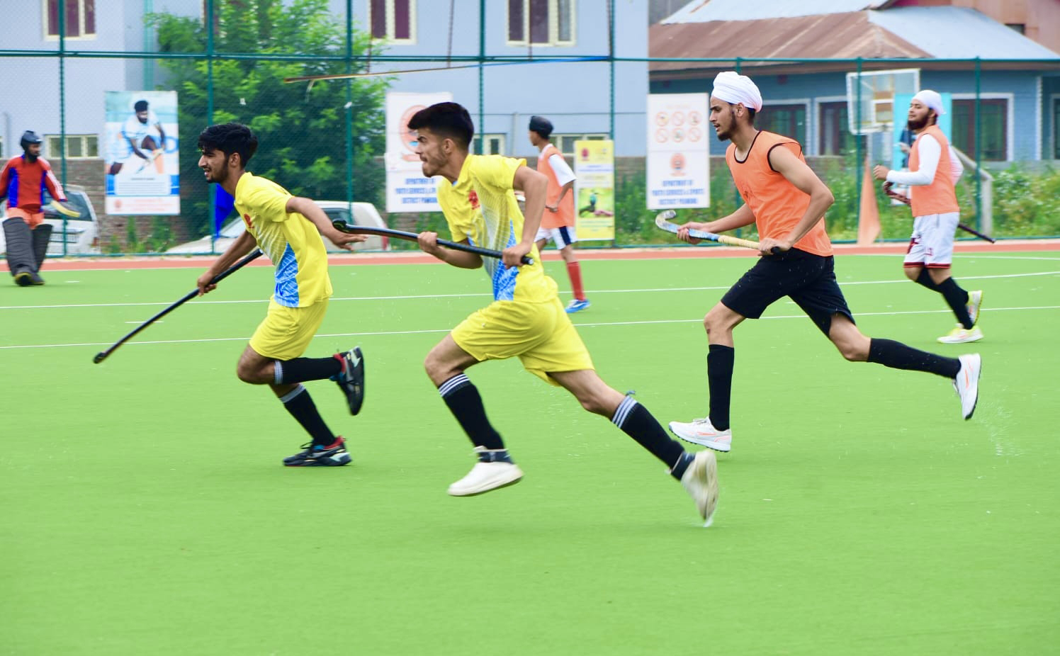 Hockey players in action during a match in Pulwama today.