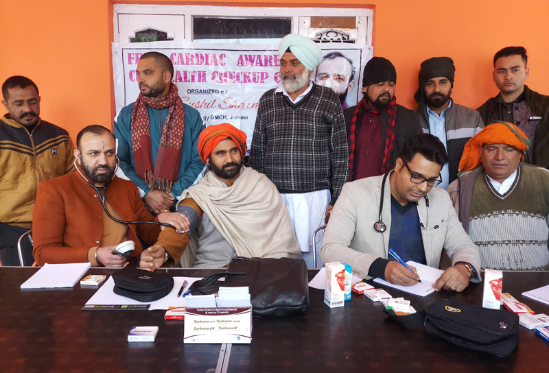 HoD Cardiology Dr Sushil Sharma examining patients at Swankha in Samba district on Sunday.