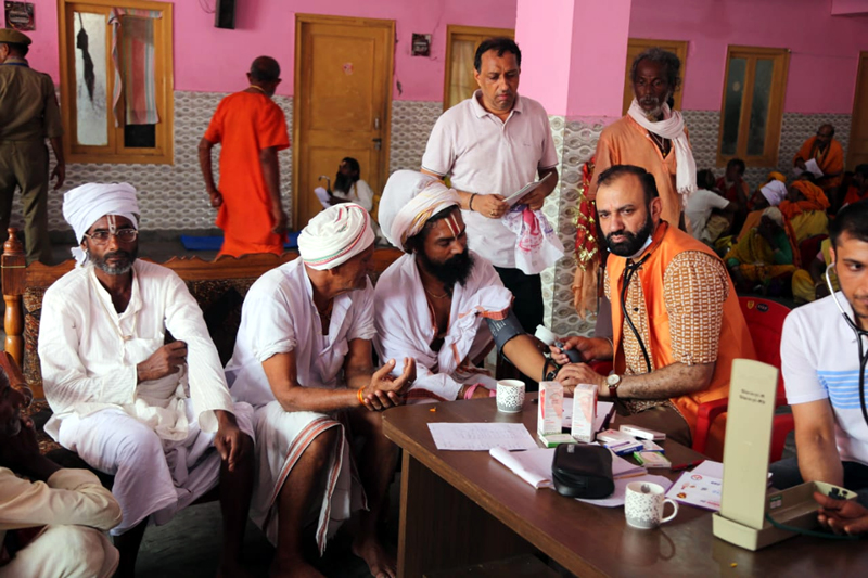 HoD Cardiology Dr Sushil Sharma examining Shri Amarnath Ji bound Sadhus at Purani Mandi on Sunday.