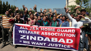 Large number of Home Guards assembled outside Press Club under the banner of All J&K Home Guard Welfare Association and held protest.