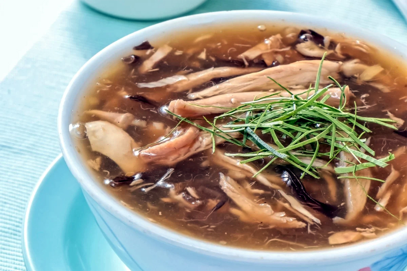 The snake bones then are simmered with chicken and pork bones for at least six hours to make the soup base. Next, the broth is stewed with snake meat, shredded chicken, ham, fungus and mandarin orange peel before finally being thickened with starch.