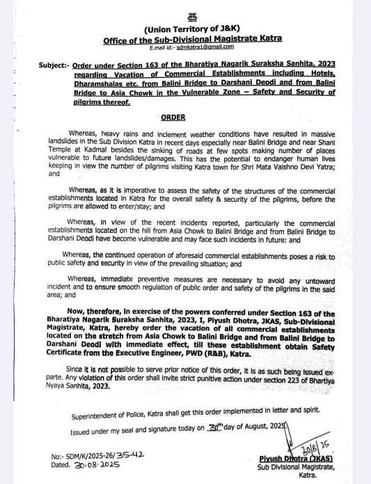 In an order, Katra Sub-Division Magistrate (SDM) Piyush Dhotra ordered the vacation of all commercial establishments, including hotels and dharamshals from Balini bridge to Darshani Deodi and from Balini bridge to Asia Chowk in the vulnerable zones for the safety and security of the pilgrims.