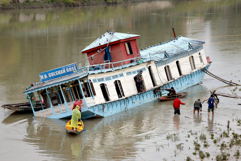 After sustained efforts, the houseboat was brought back to an upright position and secured with ropes tied to trees and other structures along the riverbank.