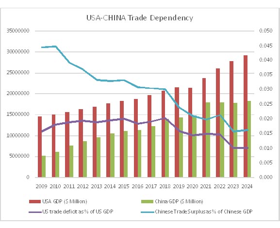 Tariffs may not be effective, as trade interdependence between the US and China has decreased over the past decade. Data reveals that China’s reliance on the US has declined at a faster rate. In contrast, the US continued to remain dependent on China. Between 2009 and 2024, China’s GDP grew at a compound annual growth rate (CAGR) of 9.01%. Excluding China’s trade component with the US, the Chinese economy grew at a slightly lower pace of 8.62%. In contrast, the US economy grew at a CAGR of 4.78% during the same period, and without China, the US economy’s growth rate drops to 4.07%. These small changes in growth rate numbers are significant in absolute terms, especially when considering the two largest economies in the world—the US at $29.16 trillion and China at $18.27 trillion in 2024.