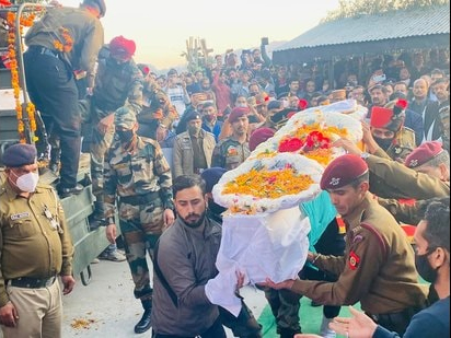 TAPOVAN(Dharamshala), Dec 12: Lance Naik Vivek Kumar who died in the helicopter crash in Coonoor in Tamil Nadu along with CDS Gen Bipin Rawat and eleven others, was on Saturday evening cremated with full state honors at his native village in Jaisinghpur area of Kangra district of Himachal Pradesh, it was reported on Sunday.