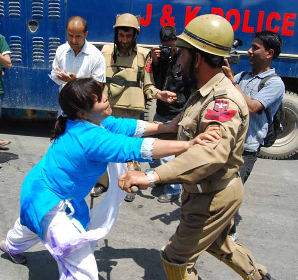 Senior JCC member and women employee leader, Syeda Ladakhi, appeared near the Police Control Room and marched towards the Civil Secretariat. One of the cops manhandled the JCC member and this led to exchange of blows between the two. Syeda Ladakhi pushed some eight police cops and she raised strong protest against her manhandling by police.