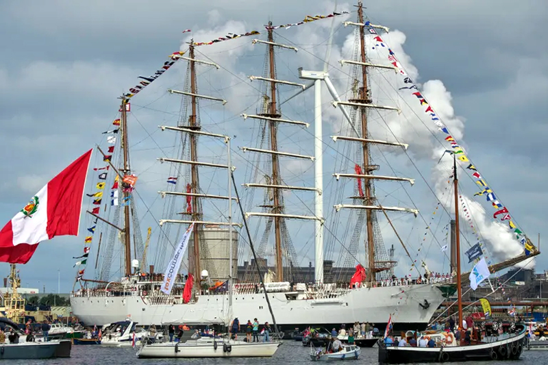 A puff of orange smoke erupted into the sky and ships’ horns sounded as the replica three-masted clipper Stad Amsterdam passed through a lock to mark the official start of the event. Each ship is greeted with two cannon shots and its country’s national anthem as it enters the harbour.