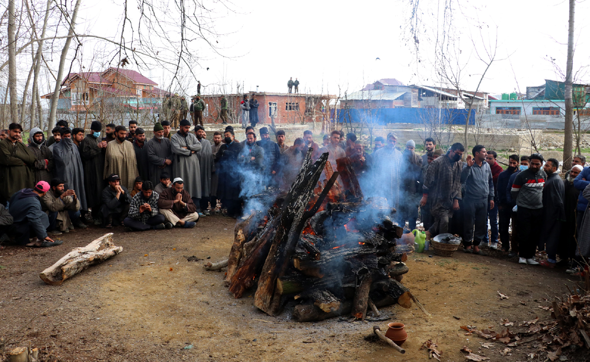 Hundreds of local Muslims participating in last rites of Sanjay Sharma at his native village in Achan, Pulwama on Monday. -Excelsior/Younis Khaliq