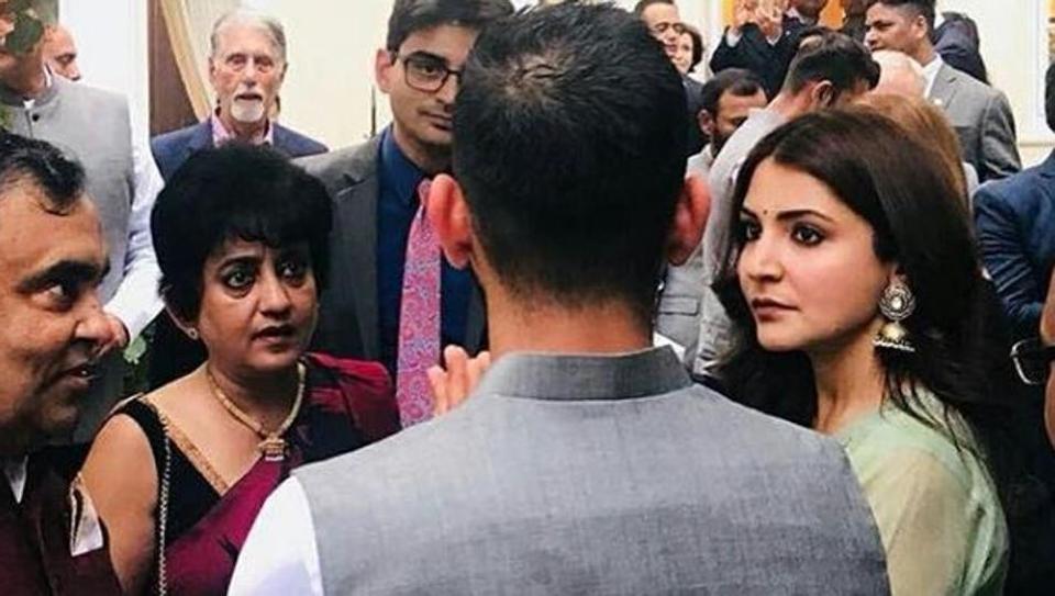 The photograph, in which Anushka and her husband, Indian cricket captain Virat Kohli, are seen standing in the front, was taken at the Indian High Commissioner’s office in London during an official dinner.