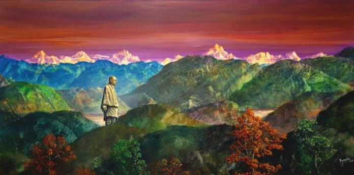 His live painting, an evocative panorama capturing the majestic Vindhyachal mountain ranges with the emergent figure of Sardar Patel’s Statue of Unity rising with quiet authority, became a focal point of admiration.