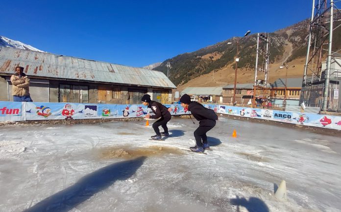 Srinagar, Jan 1: Two young siblings who have participated in the nationals of Ice Skating, representing Jammu and Kashmir, showcased their skills today at the newly inaugurated skating rink in the tourist resort Sonamarg. They encouraged girls to engage in this unique sport.