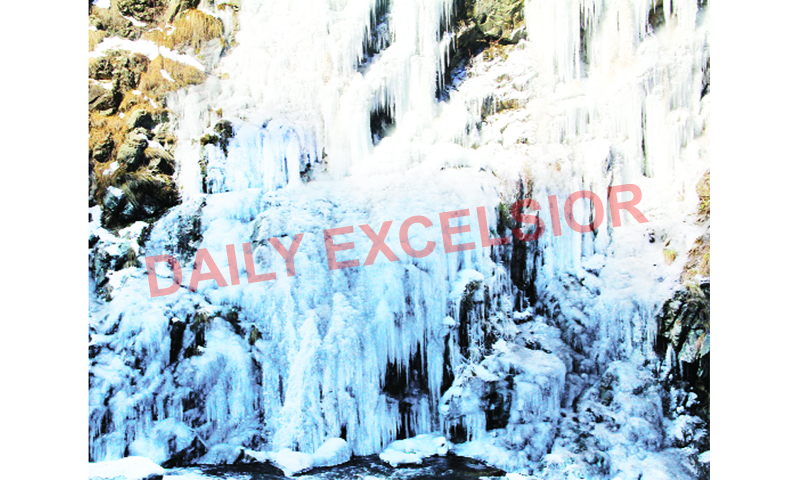 Icicles hang from a partially frozen waterfall at Tangmarg as temperature dips to sub-zero in various parts of Kashmir. -Excelsior/ Aabid Nabi