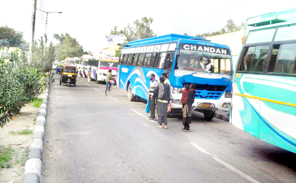 Idle parking of buses on BC Road causing traffic congestion near Jammu Bus Stand.