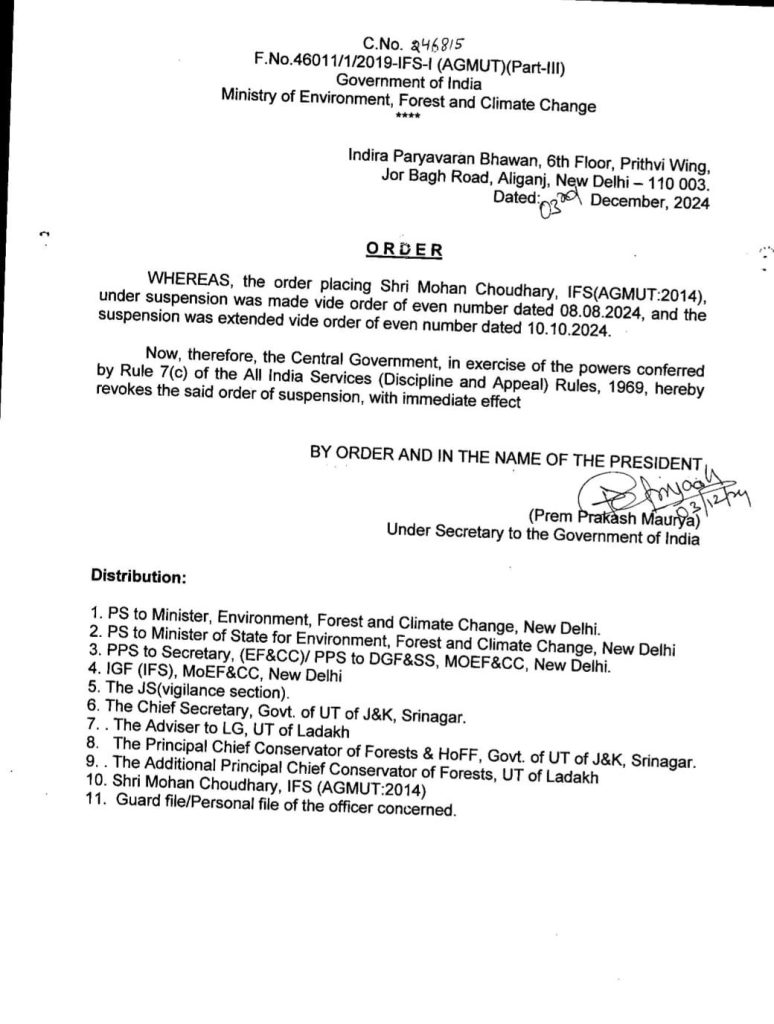 IFS Officer Mohan Choudhary’s Suspension Order Revoked By Daily Excelsior - December 4, 2024 Share FacebookTwitterWhatsAppPinterestLinkedinCopy URLTelegramEmailTumblrReddItPrintKoo JAMMU, Dec 4: The Ministry of Environment, Forest and Climate Change, Government of India has revoked the suspension order of 2014 batch AGMUT cadre IFS officer Mohan Choudhary. Follow our WhatsApp channel