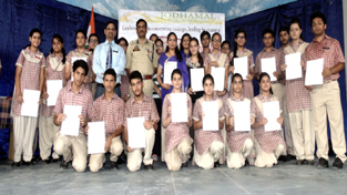 IGP Jammu Rajesh Kumar and Principal Trilok Singh Bist posing alongwith the winners during felicitation function at Jodhamal School.