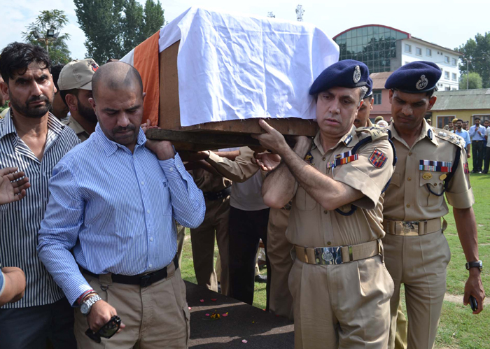 IGP Kashmir Abdul Gani Mir carries the coffin of killed SOG cop on Monday. —Excelsior/Amin War