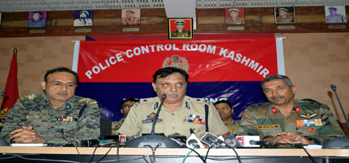 IGP Kashmir Muneer Khan, IG CRPF and GOC force address a joint press conference at PCR Srinagar on Thursday.-Excelsior/Shakeel