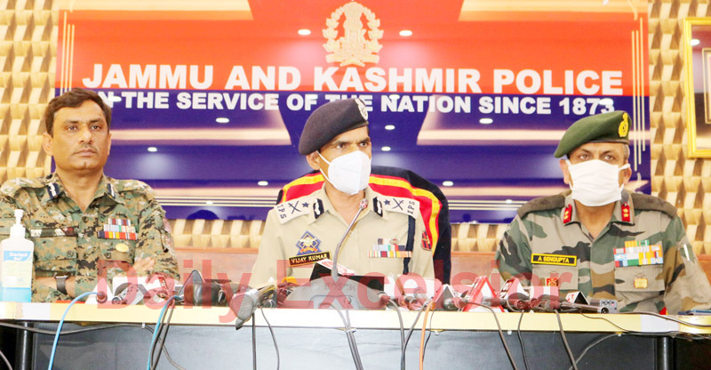 IGP Kashmir Vijay Kumar along with Army and CRPF officers addressing a press conference in Srinagar on Wednesday. -Excelsior/Shakeel By Daily Excelsior - June 4, 2020 Share FacebookTwitterWhatsAppPinterestLinkedinCopy URLTelegramEmailTumblrReddItPrintKoo IGP Kashmir Vijay Kumar along with Army and CRPF officers addressing a press conference in Srinagar on Wednesday. -Excelsior/Shakeel IGP Kashmir Vijay Kumar along with Army and CRPF officers addressing a press conference in Srinagar on Wednesday. -Excelsior/Shakeel Follow our WhatsApp channel