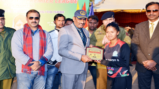 IGP Security Rajesh Kumar honouring winner of women of the match award in presence of Ranjeet Kalra and other dignitaries in Jammu.
