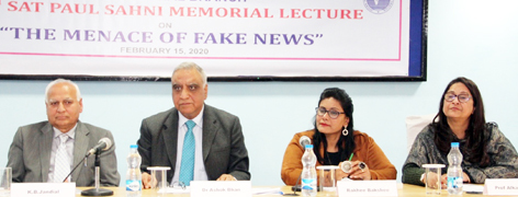 JAMMU, Feb 15: While speaking on 10th Sat Paul Sahni Memorial Lecture on the topic “The Menace of Fake News”, organized by Indian Institute of Public Administration (IIPA), J&K Regional Branch, Rakhee Bakshee, Political Analyst, ABP News, New Delhi, said that citizens have to be proactive and de-contextualize the news, as it has a potential to influence their minds and emotions.