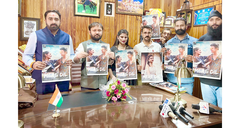 Ikkjut Jammu president Ankur Sharma along with Dogri singer Ridhi Bhagat and others releasing poster of new Dogri song 'Mere Dil'.