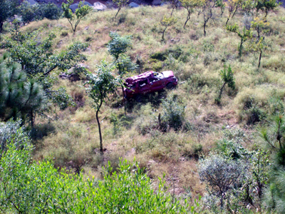Ill-fated Tavera lying in a gorge near Chenani on Jammu-Srinagar National Highway on Saturday.