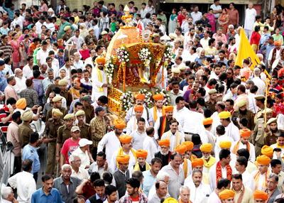 JAMMU, Mar 28:  An impressive and colourful ‘shobha yatra’ (religious procession) was today taken out on the occasion of Ramnavmi, the birthday of Lord Rama- here today. Member Parliament and Chairman Trustee Dr Karan Singh attended Shoba Murti Poojan at Shri Raghunath Ji Temple. The ‘Rath Yatra’ was organised by Jammu and Kashmir Dharmarth Trust.
