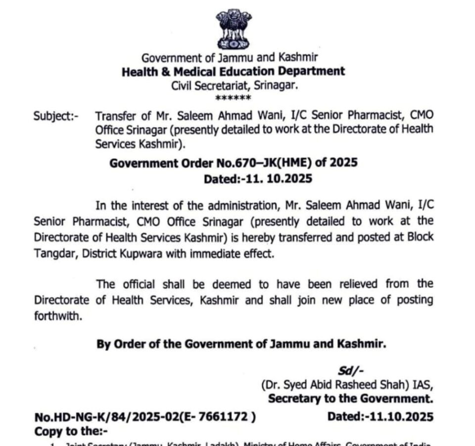 Srinagar, Oct 12: The Government of Jammu and Kashmir, Health & Medical Education Department, has ordered the immediate transfer of ,in-charge senior pharmacist at the CMO Office Srinagar, to Block Tangdhar in District Kupwara.