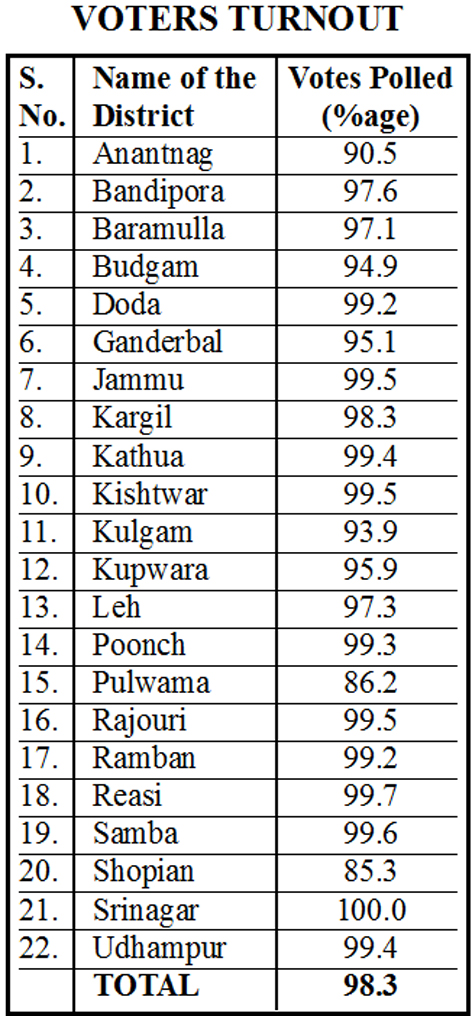 Significantly, Srinagar district recorded 100 percent turnout while lowest 85.3 percent polling was registered in Shopian. Number of districts accounted for around 99 percent polling. Overall voting percentage stood at 98.3.