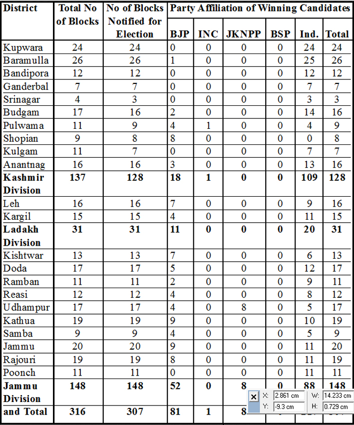 As many as 109 Independent candidates won the chairpersonship of the BDCs in Kashmir followed by 88 in Jammu and 20 in Ladakh totaling 217.