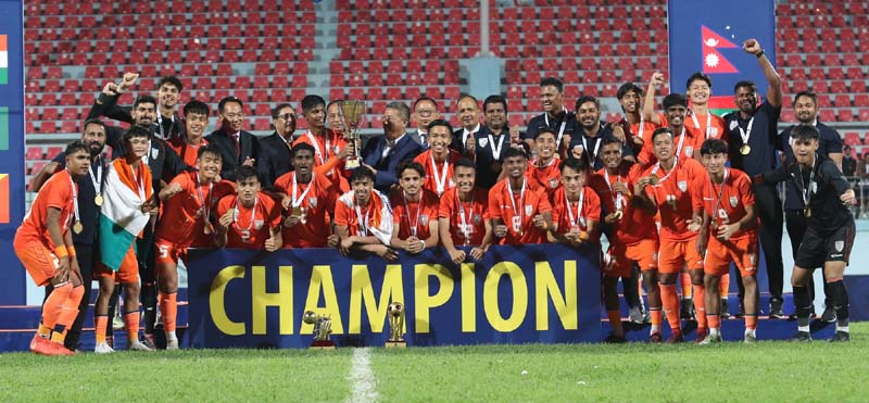 After a wait-and-see approach for the first 45 minutes, the Blue Colts decided to crack the whip in the second session and emerged the SAFF Men’s U19 champions with a vigorous 3-0 triumph over Pakistan at the Dashrath Stadium here on Saturday.