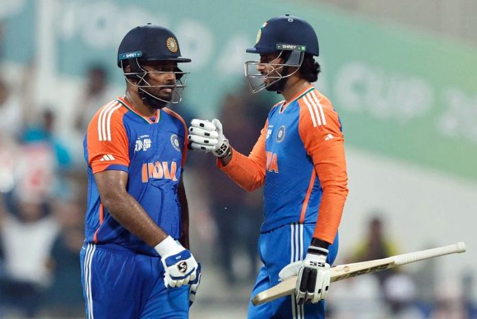 Sanju Samson struck a 45-ball 56 and Abhishek Sharma provided the early momentum with a 15-ball 38 as India scored 188 for eight.