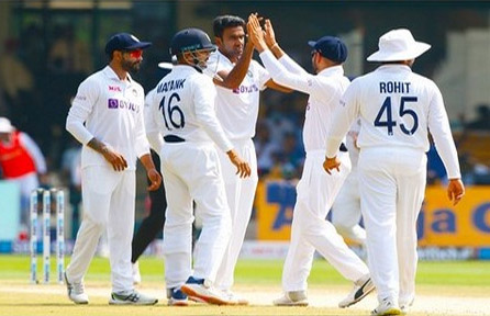 Brief Scores: India 252/10 & 303/9 Declare vs SL 109/10 & 208/10 (Dimuth Karunaratne 107, Kusal Mendis 54; Ravichandran Ashwin 4/78) (Agencies)