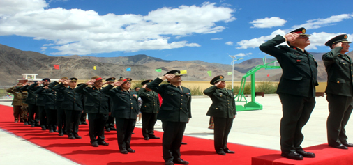 India and China Army officials take salutes before the meeting in Eastern Ladakh on Monday.