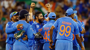 Members of the Indian team celebrate after they ran out South Africa’s captain AB de Villiers for 30 runs during Cricket World Cup match at the Melbourne Cricket Ground on Sunday. (UNI)