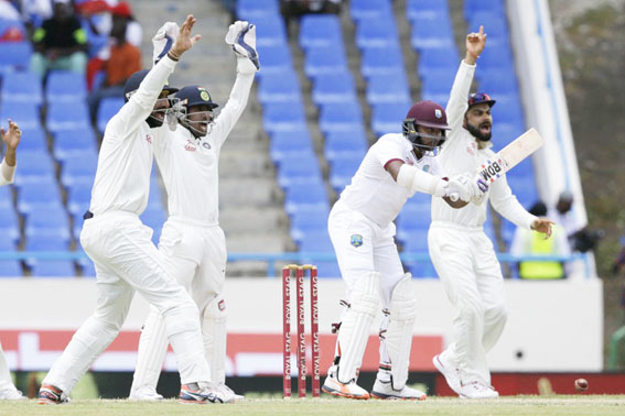 Four deliveries later, it became a double blow, as Jermaine Blackwood (0) was unable to fend off a sharp rising delivery and was caught at gully by Ajinkya Rahane. (AGENCIES)