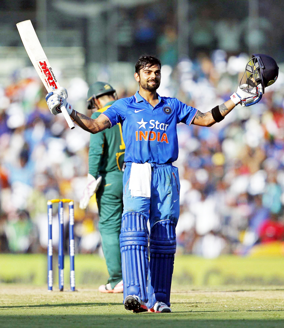 Virat Kohli raises bat to celebrate his century during fourth One-Day International cricket match against South Africa in Chennai on Thursday. (UNI)