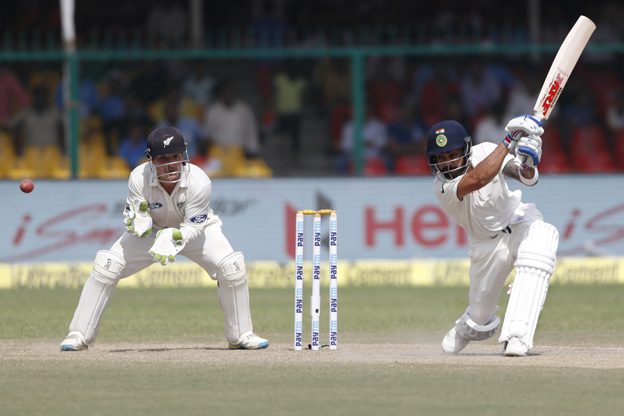 India's captain Virat Kohli, right, bats on the fourth day of their first cricket test match against New Zealand at Green Park Stadium in Kanpur, India, Sunday, Sept. 25, 2016. (AP Photo/ Tsering Topgyal)
